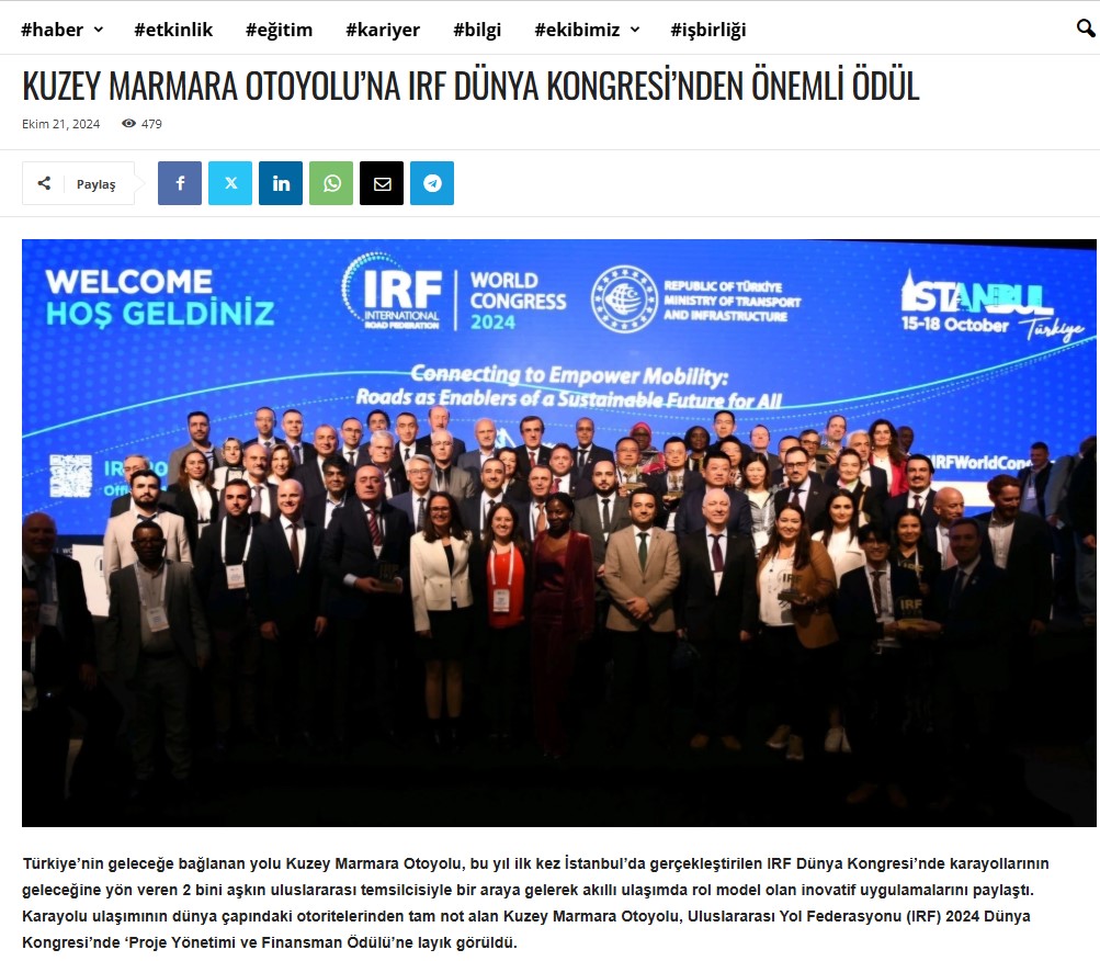 Kuzey Marmara Otoyolu'nda IRF Dünya Kongresi'nden Önemli Ödül